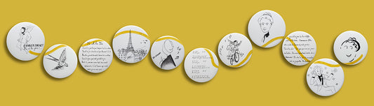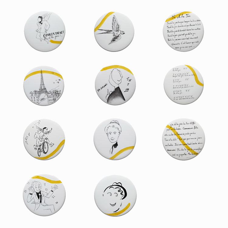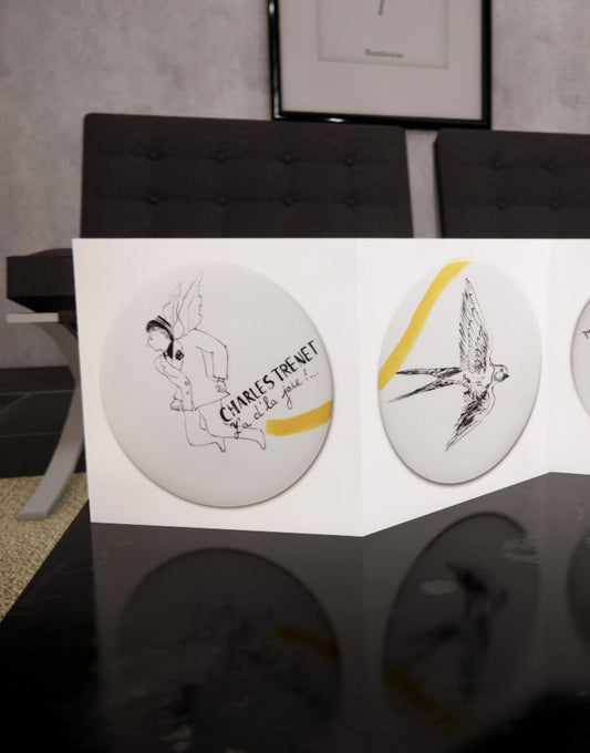 Chez Art Your Song, y a de la joie... et travailler cette immense chanson de Charles TRENET à travers la plume de Véronique JOLY CORBIN est un honneur. Elle choisit de dessiner sur porcelaine de Limoges son "Y’a d’la joie" comme un besoin post-COVID de retrouver ce sentiment-là… Elle montre la chanson à travers son époque : les mots se mêlent aux dessins et aux notes sur 11 cercles de porcelaine d'environ 20 cm de diamètre.