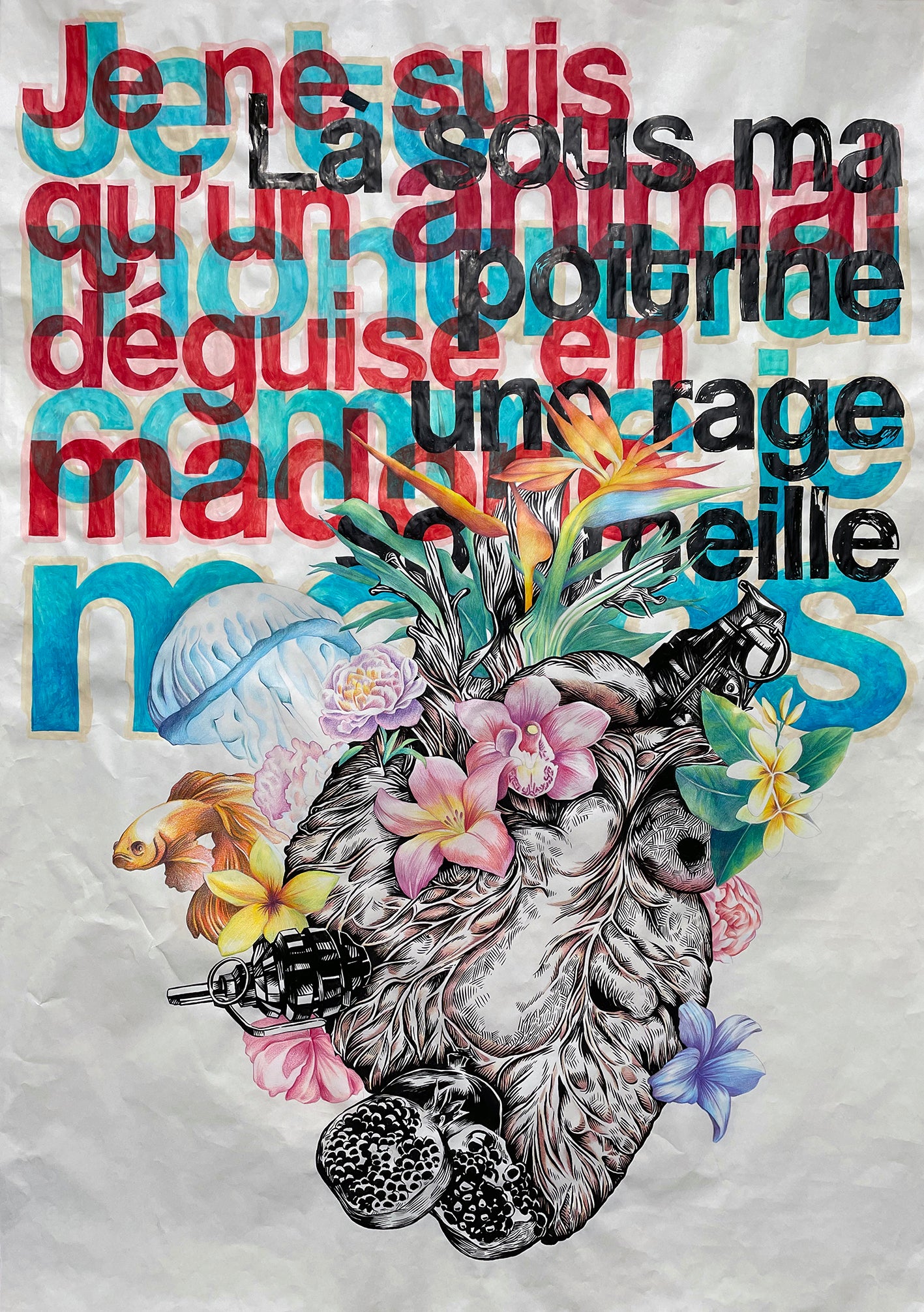 L'artiste fusionne habilement diverses techniques, de la peinture aux crayons de couleur, de l'encre de Chine à d'autres médiums, pour créer un chef-d'œuvre qui éclate de vie et de dynamisme.